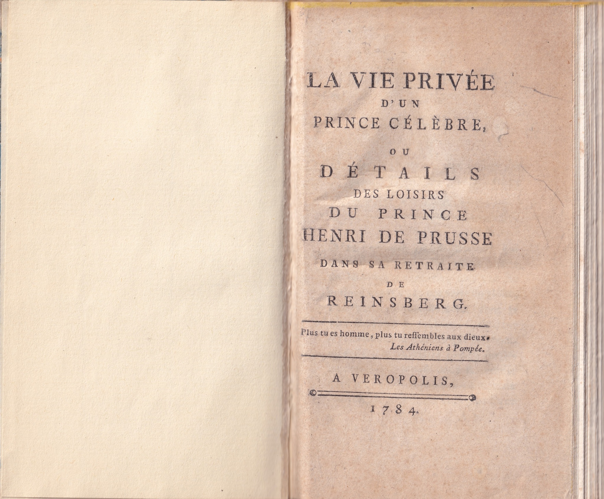 Dieser kleine Band beschreibt das Leben von Prinz Heinrich in Rheinsberg. Es gibt eine deutsche Ausgabe mit dem Titel:“ Schilderung des Privat-Lebens eines großen Prinzen; oder geheime Nachrichten von den Vergnügungen des Prinzen Heinrichs von Preussen zu Reinsberg“